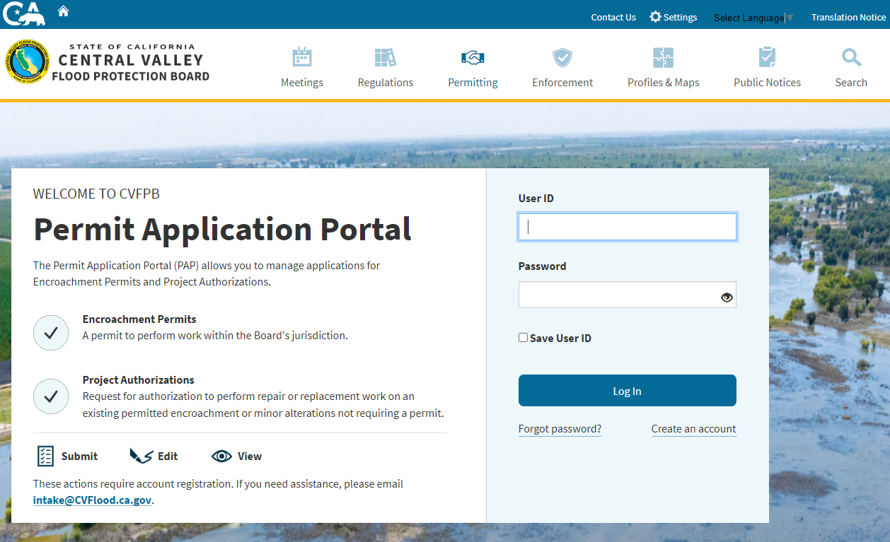Starting in January 2026, the Central Valley Flood Protection Board you can submit permit applications through the Permit Application Portal. There you may create an account, apply for permits, maintenance concurrences, and minor alteration authorizations. The portal allows you to apply for multiple permits, get endorsements from local agencies, and track you application through the permitting process, all in one place. Check back on our website for a link to the portal in January 2026!